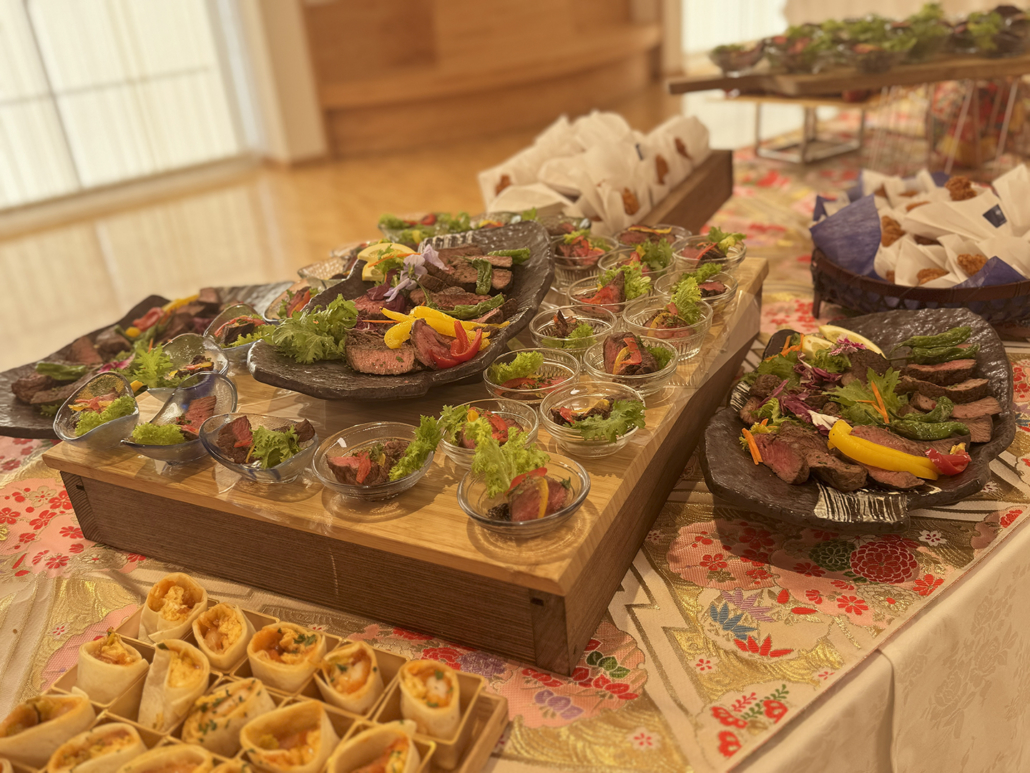 - メイン卓:ピンチョス仕立て(ステーキ、生ハム、鴨ロース)、ミニバーガー、ブルスケッタ、スパニッシュオムレツ、他